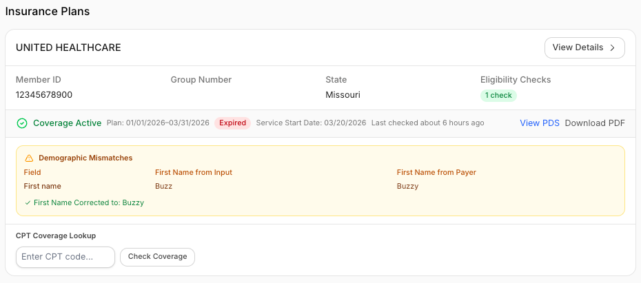This change means that even if there are demographic errors in your initial claim status request, the Claim Status Agent now has the ability to fix them using data returned from payers. We will also tell you what was incorrect and what we fixed. For example, if Buzz Lightyear's claim status had demographic errors, the fix might look like this: