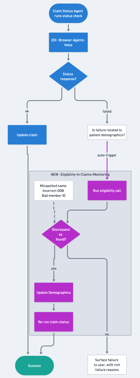 With this change, the Substrate Claim Status Agent has a new tool to resolve claim statuses. It can independently run a real time eligibility call (270/271 EDI transaction + eligibility browser agents), troubleshoot discrepancies in patient demographics, fix them, and rerun the claim status request with the updated patient data to get a successful response.